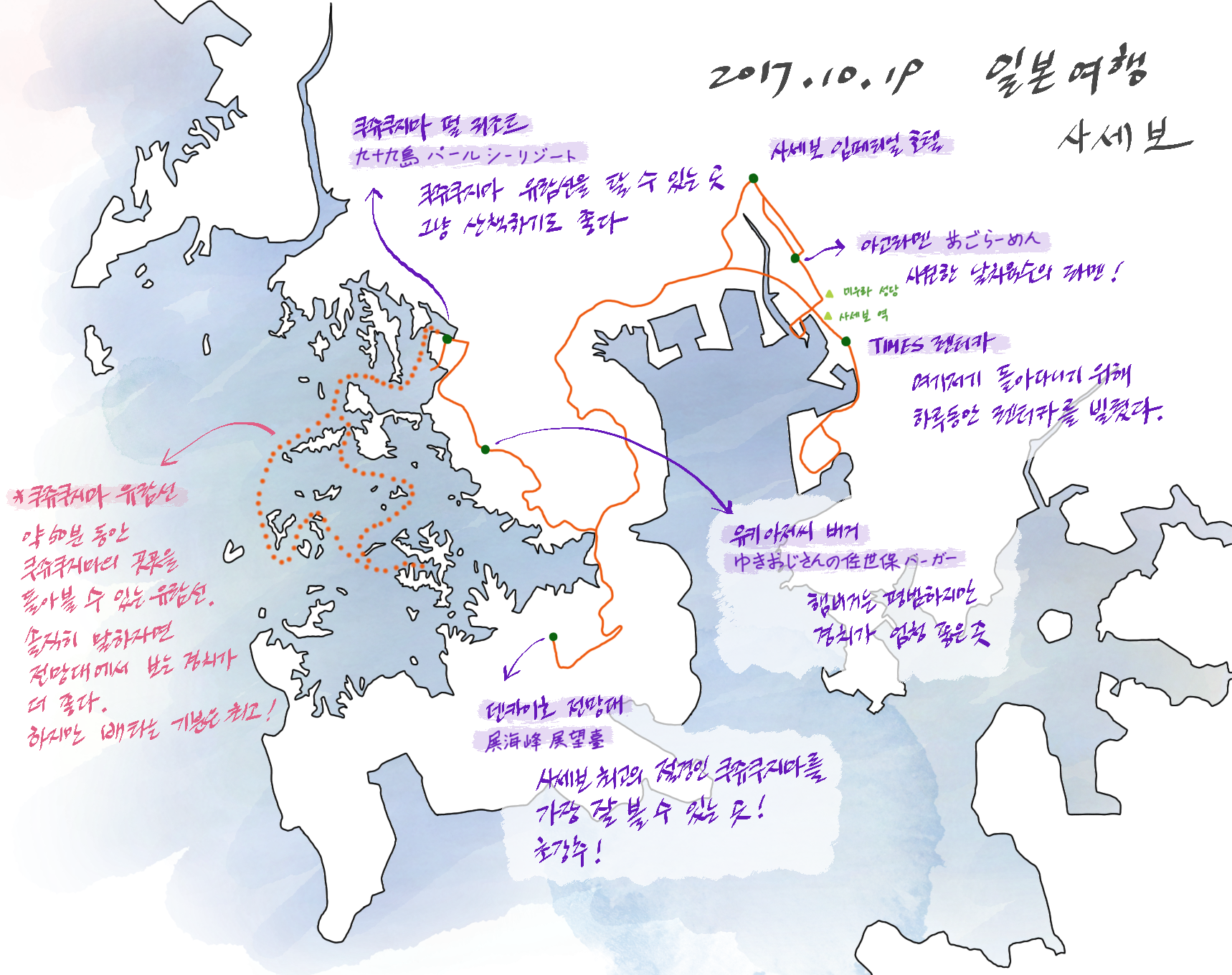 이곳에서 한참 동안 크고 작은 섬들이 모여서 만들어내는 장관을 감상했다. 사세보에 오길 잘했다는 생각이 들었다. 오로지 이 한 장면만으로 말이다. 아마도 날씨가 도와줬다는 사실이 크게 한 몫했을 거다.