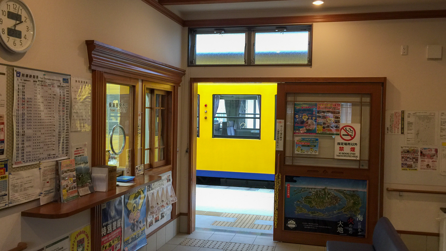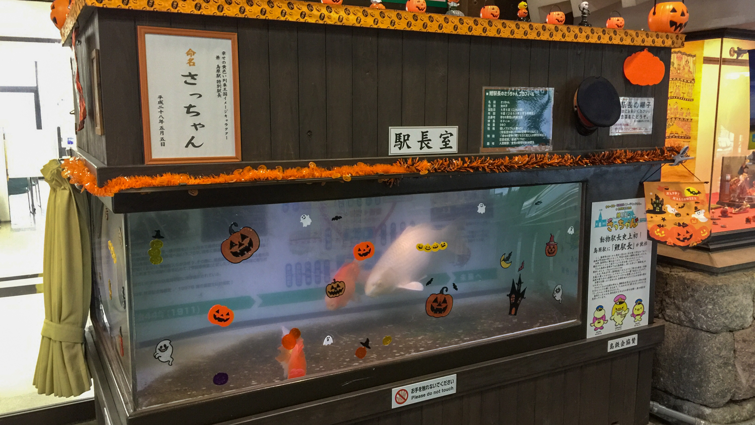 시마바라 성터에서 내려오면 바로 시마바라 역(島原駅)이 나온다. 사실 '역'을 굳이 방문할 필요는 없다고 생각했는데, 이곳에는 '잉어 역장'이 있다고 해서 들렀다. 역사에 들어가니 정말 커다란 어항이 있고, 어항 위에는 '역장실'이라는 푯말이 붙어 있다. 역장의 이름은 삿짱이라고 한다.