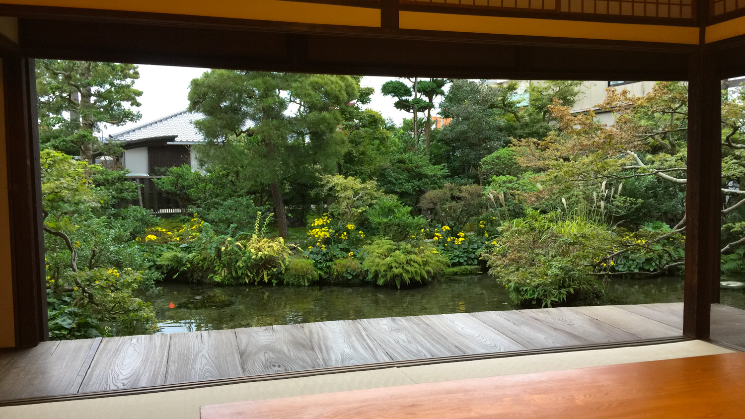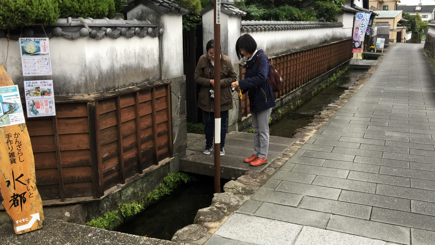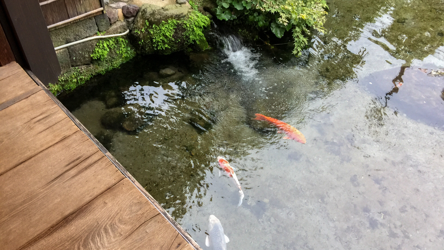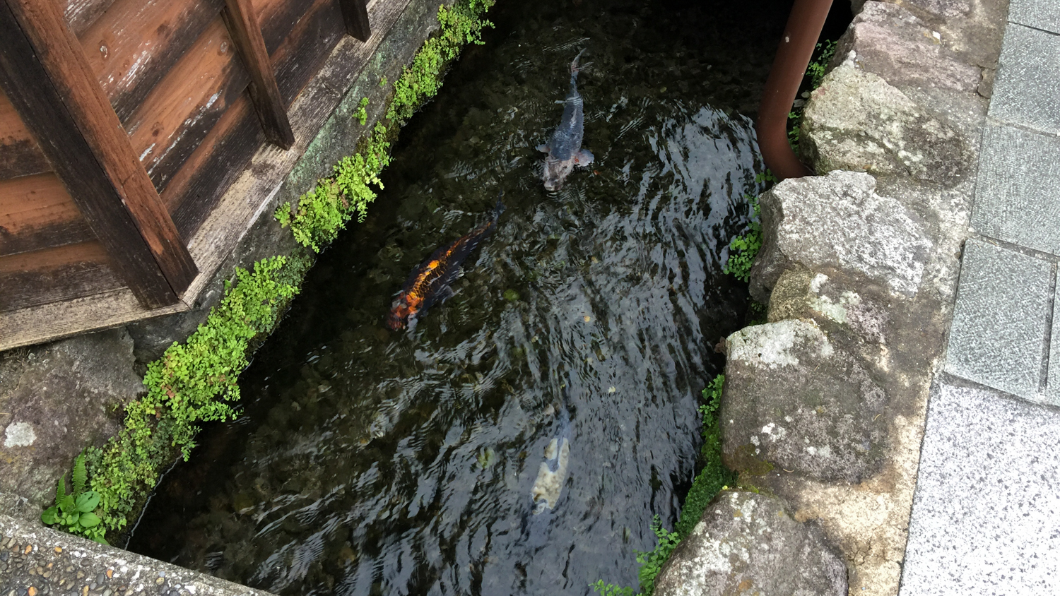 골목골목을 걷다가 신메이소(四明荘)라는 곳을 발견했다. 물이 솟아나는 정원(湧水庭園)이라는 별칭이 붙어있는 곳이었다. 약 300엔 정도의 입장료를 내야 하는 곳인데 들어가면 차를 한 잔 내어 주신다. 차를 마시면서 일본식 정원에 앉아 잉어와 녹음을 볼 수 있는 곳인데, 잔잔한 느낌이 좋은 곳이라 입장료가 아깝지 않은 곳이다. 실제로 정원 한쪽 끝에는 바닥에서 솟아나는 물을 볼 수 있는 곳이 있다.