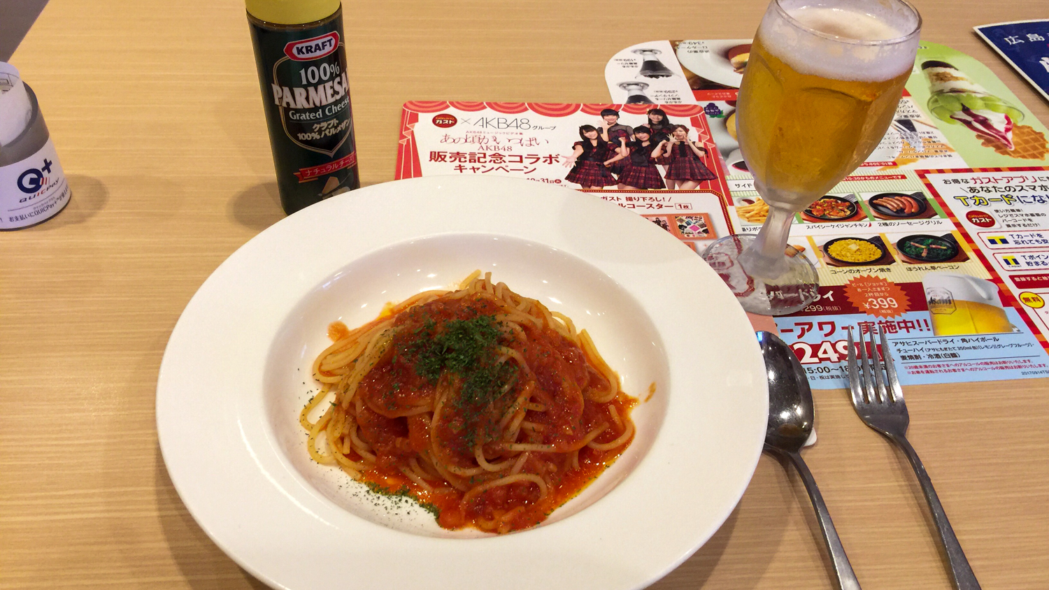 시간이 애매해서 그런 건지 토요일이라서 그런 건지는 모르겠지만 문을 연 식당을 찾을 수 없었다. 겨우 찾은 곳은 가스토(ガスト)라는 패밀리 레스토랑. 원래 크림 파스타를 더 좋아하는 편인데 이상하게 토마토소스의 파스타가 땡겨서 맥주와 함께 늦은 점심을 먹었다. 이때 시간이 세시 즈음 됐을 거다.