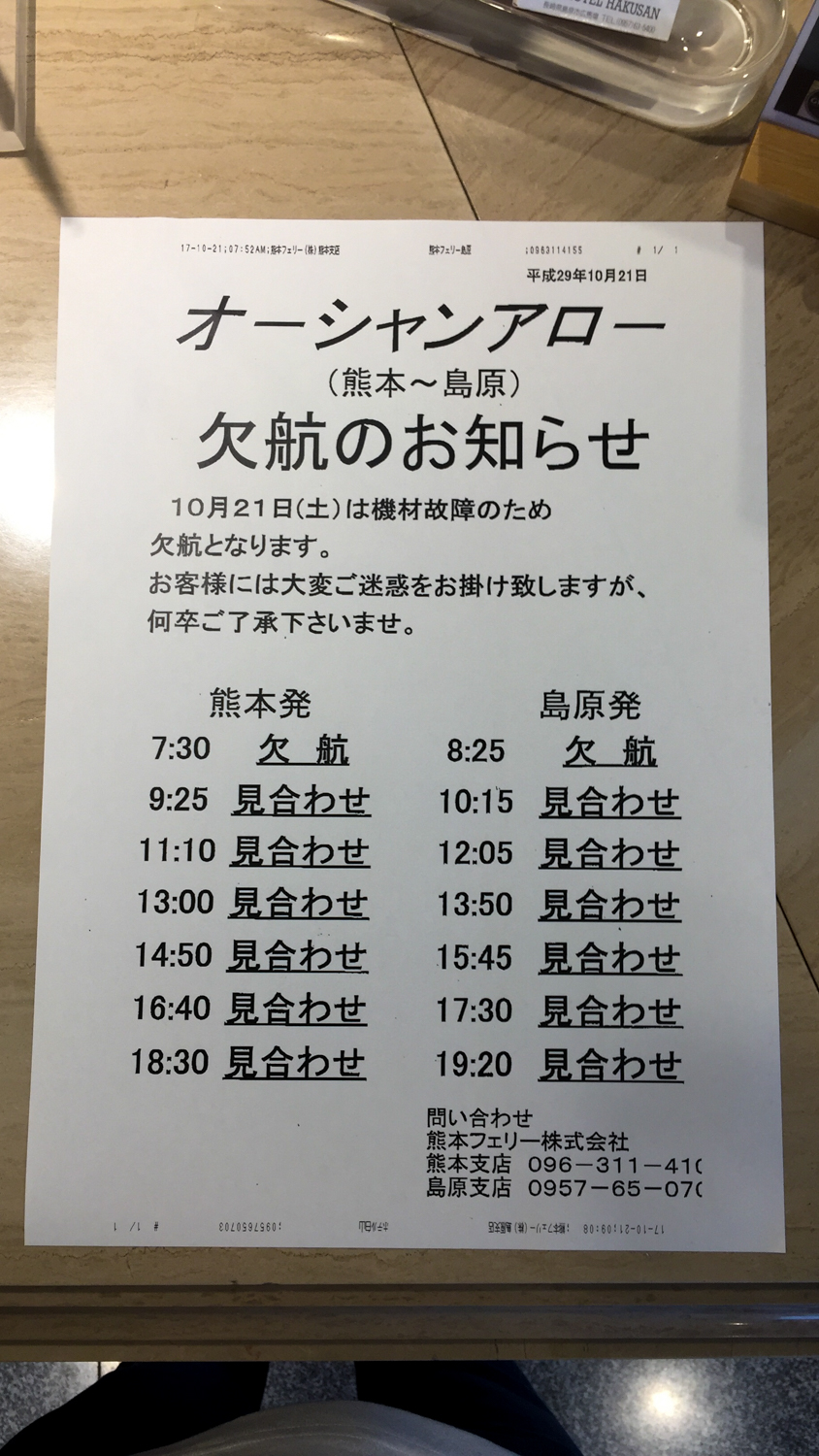 역을 나서는데 뭔가 느낌이 쌔~ 한 공지가 하나 보였다. 모두 제대로 읽을 수는 없지만 [熊本 ~ 島原]는 구마모토에서 시마바라를 연결하다는 뜻인 것 같고 [欠航]은 '결항'이라고 읽는 게 맞겠지??? 오늘 아침에 결항이 있었다는 얘기구나...