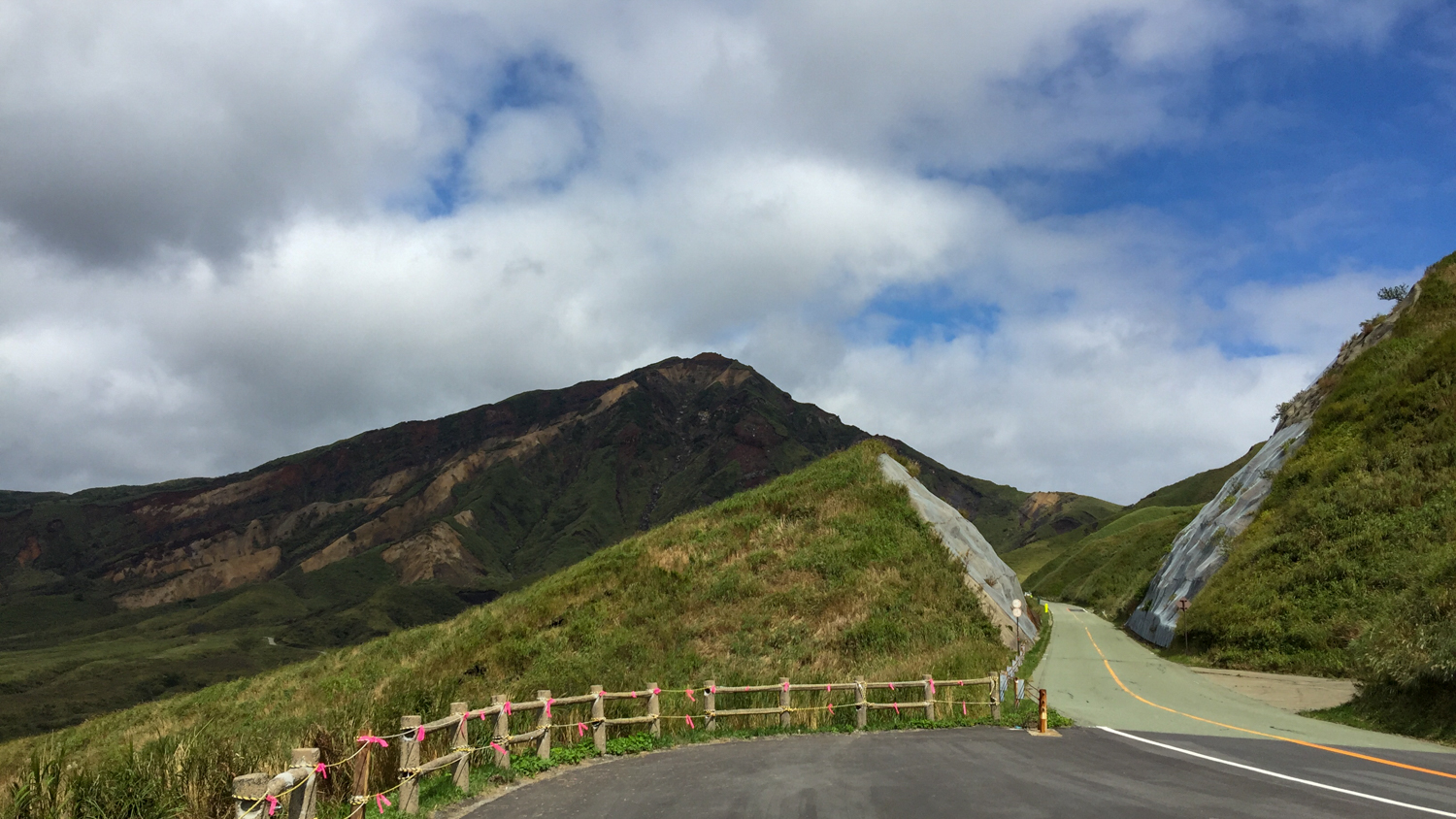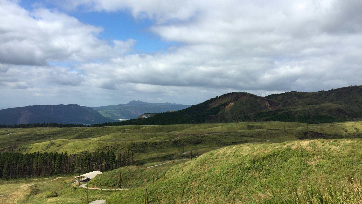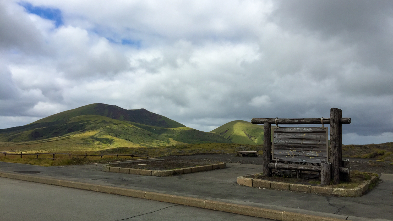 편의점을 출발하니 본격적인 아소산 드라이브가 시작됐다. 화산 활동이 계속되고 있는 곳이라 땅이 뜨겁기 때문일까? 키가 큰 식물들이 사라지고 낮은 키의 식물들이 펼쳐진 풍경이 나타난다. 험준한 산세와 부드러운 구릉이 섞여 있고, 키가 낮은 식물들이 촥~ 깔려 있는 모습은 처음 보는 특이한 풍경이었다. 마침 도로에 차들이 다니고 있지 않아서 아무 데나 마음껏 차를 세우고 사진을 찍을 수 있었다.