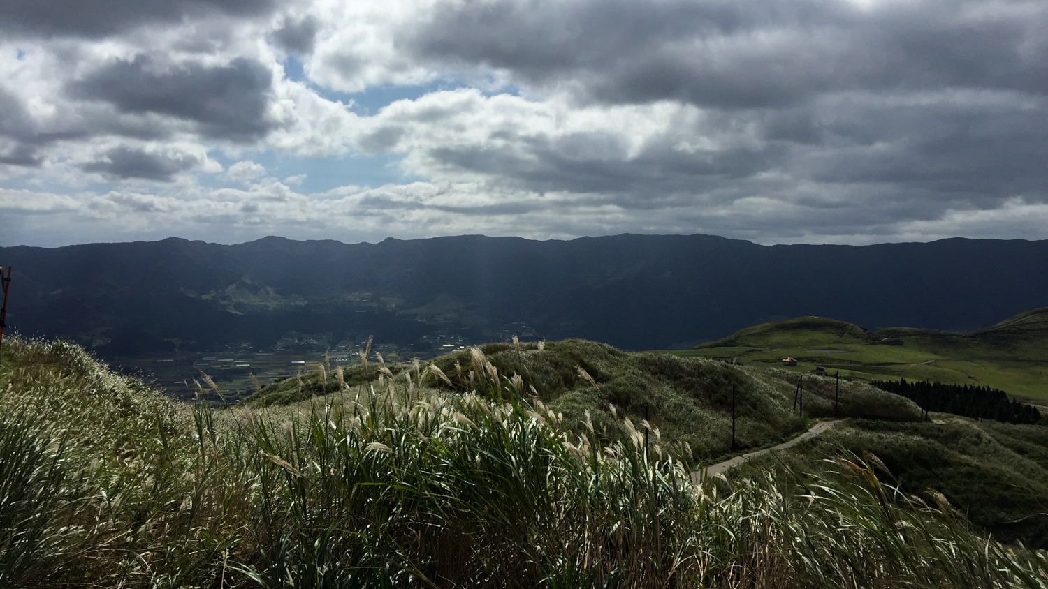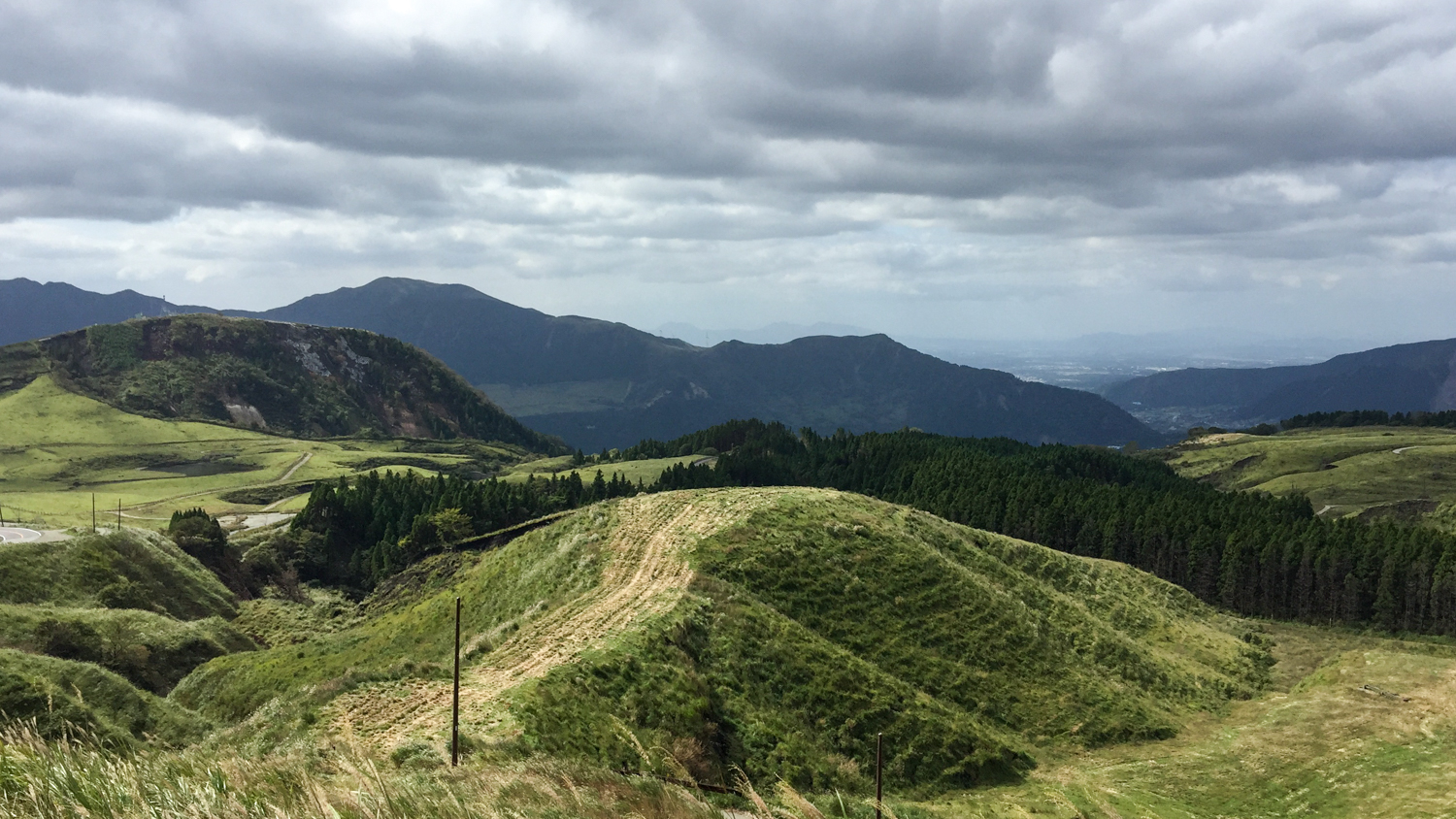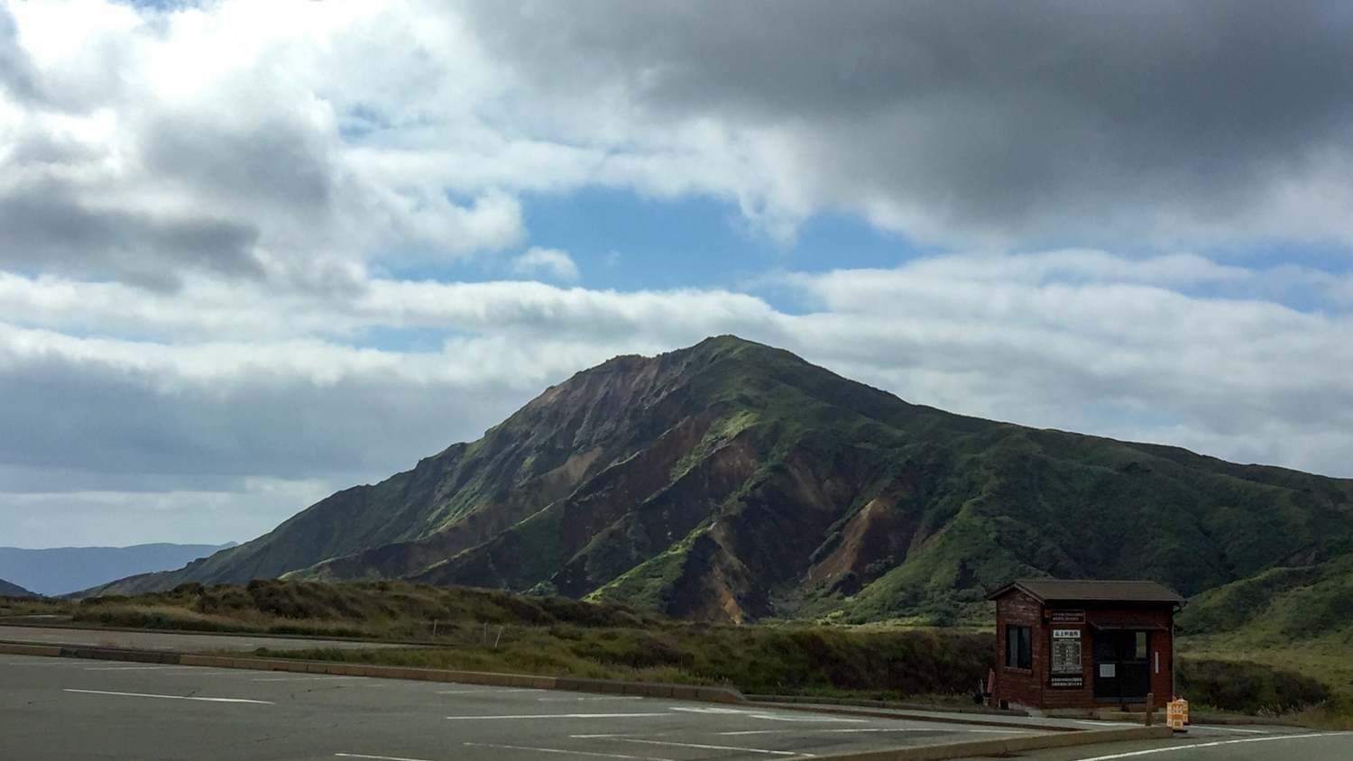 편의점을 출발하니 본격적인 아소산 드라이브가 시작됐다. 화산 활동이 계속되고 있는 곳이라 땅이 뜨겁기 때문일까? 키가 큰 식물들이 사라지고 낮은 키의 식물들이 펼쳐진 풍경이 나타난다. 험준한 산세와 부드러운 구릉이 섞여 있고, 키가 낮은 식물들이 촥~ 깔려 있는 모습은 처음 보는 특이한 풍경이었다. 마침 도로에 차들이 다니고 있지 않아서 아무 데나 마음껏 차를 세우고 사진을 찍을 수 있었다.
