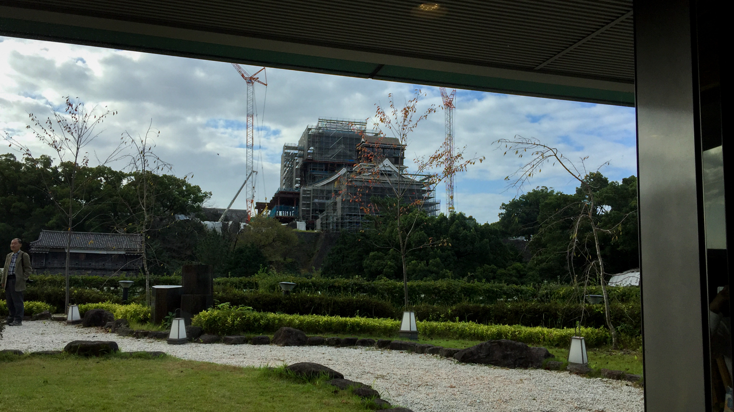 조식을 먹는 식당에서 창 밖을 보면 보수 공사 중인 구마모토성을 볼 수 있다. 2016년 구마모토 지진으로 무너진 곳들을 보수하는 중. 2019년 천수각 복원이 목표이고, 총 20년 정도에 걸쳐 모든 곳을 복원할 예정이라고 하니... 아직 공사 중이겠지만 천수각은 복원이 끝났... 으려나? 어쨌든 사진에 보이는 곳이 바로 공사 중인 천수각.