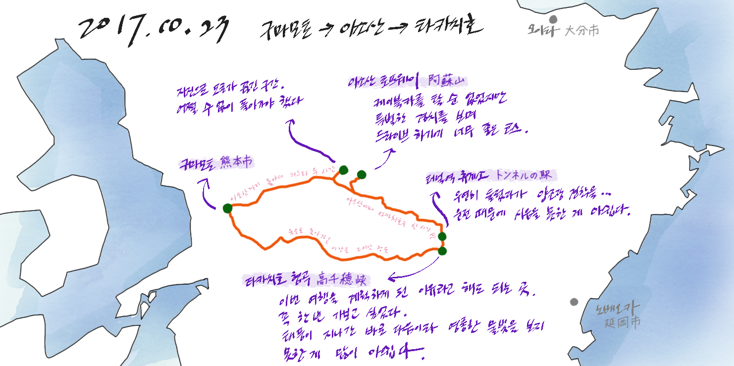 멀리 보이는 아소산(阿蘇山)이 꽤나 웅장하게 보이는 곳이었다. 편의점에 들러 녹차를 하나 사고, 화장실을 다녀왔다. 모든 편의점이 그랬는지는 정확하게 기억나지 않는데, 편의점에 있는 화장실을 마치 공용 화장실처럼 쓸 수 있는 곳이 많았던 것 같다.